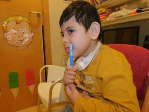 Aquí veiem com un alumne es va familiaritzant amb el Z-VIBE en una sessió de teràpia miofuncional tot seguint les indicacions que se li donen: