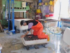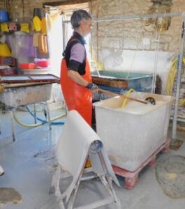 · El primer que veiem és que hi ha uns recipients molt grans amb aigua, pasta de paper… i un senyor treballant molt ben equipat amb el seu vestit impermeable, era en Diego, que estava molt enfeinat. Nosaltres també ens equipem bé amb uns davantals ben divertits.