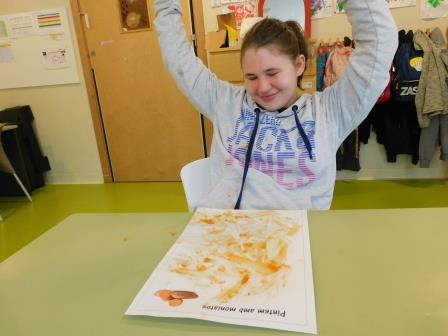 El nostre primer experiment va consistir en fer un mural amb color marró, groc i vermell. Quin creus que són els aliments que vam utilitzar? ous, suc de tomàquet i cacao.