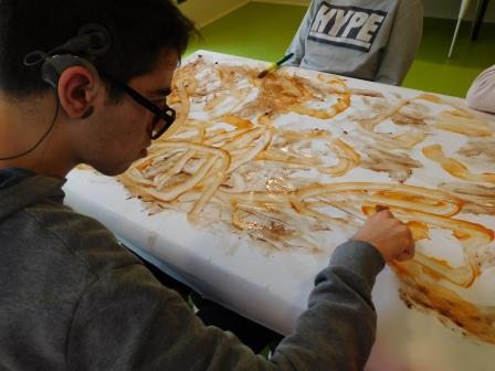 El nostre primer experiment va consistir en fer un mural amb color marró, groc i vermell. Quin creus que són els aliments que vam utilitzar? ous, suc de tomàquet i cacao.