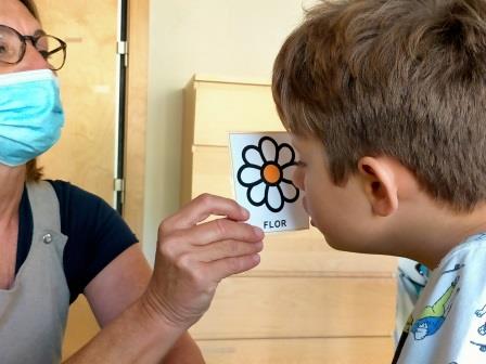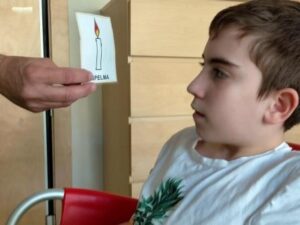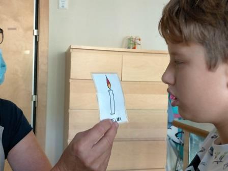 Hem començat amb les respiracions i per fer-ho tenim pictogrames que ens ajuden a entendre el que cal fer. La flor per olorar ens ajuda a fer les inspiracions, i l’espelma per bufar ens ajuda a treure l’aire.
