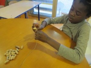 • Enfilar cacauets en un filferro per penjar als arbres. Els alumnes comptaven els cacauets que havien d’enfilar, alguns n’agrupaven 3, altres 5 i altres 10.