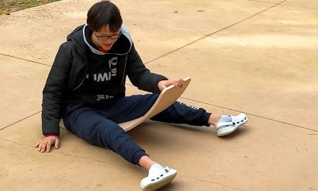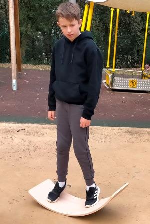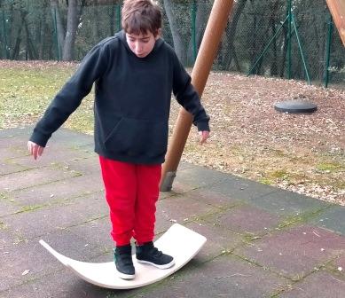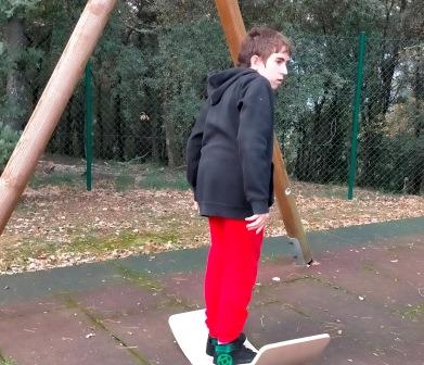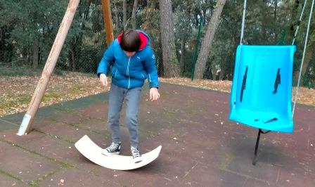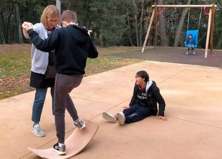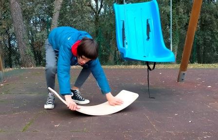 Tenim en el pati diferents elements com els gronxadors, la taula corba per treballar el sistema vestibular a través del joc.