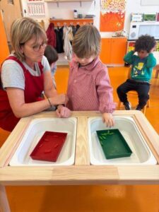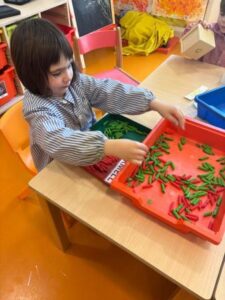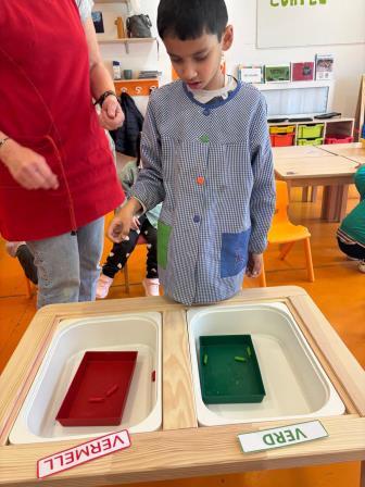 - Jocs de recollida i classificació: Fem activitats amb materials diferents com ara macarrons que consisteixen a recollir petits i classificar-los per colors o formes. Això ajuda a millorar la força de la pinça, la concentració i també altres competències d’aprenentatge