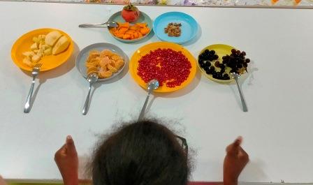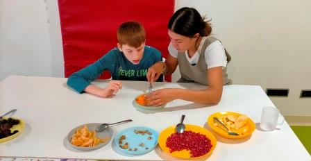 Hem provat diferents FRUITS DE LA TARDOR com la magrana, el caqui, el raïm, la mandarina, la poma i les nous. També hem OLORAT el vinagre, el cafè, la xocolata, el pebre, la llimona, la canyella i colònia. Cadascú de nosaltres hem pogut expressar què és el que més ens ha agradat o no, mitjançant l’expressió de la cara, amb un gest o amb una vocalització. Ha estat una experiència ben divertida… que segur que tornarem a repetir!!