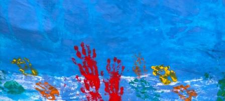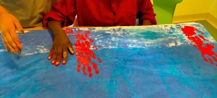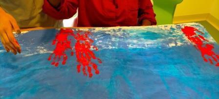 Hem col·laborat i participat, com totes les aules de l’escola, a la decoració de les diferents paradetes de les Fires de l’Escola, nosaltres hem pintat juntament amb l’aula de secundària – Els Abellerols un  llençol per la paradeta dels ànecs, amb les mans hem simulat un fons marí amb el corall de color vermell i els peixos de colors.