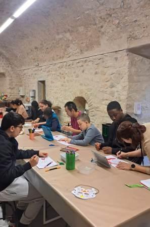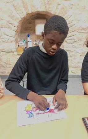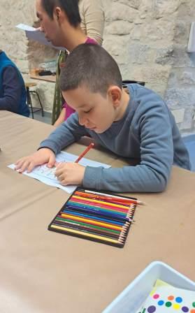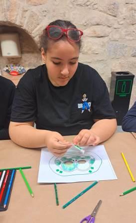Com que ja els tenim tots localitzats la Laura ens va acompanyar a l’espai habilitat per fer tallers, al pis de dalt. Ens va agradar molt el lloc perquè hi havia una taula llarguíssima i molt material. Ens van repartir les màscares per pintar i cadascú va triat com decorar-la, teníem retoladors, llapis de colors, gomets.