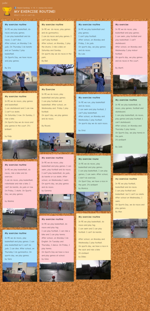 Al final de cada unitat didàctica i després d’haver après i practicat amb el vocabulari i les estructures gramaticals treballades, cadascun dels alumnes prepara un text per escrit seguint un model. El text està relacionat amb la unitat treballada. En aquesta ocasió, l’alumnat de tercer ha escrit un text sobre la seva rutina d’exercici. Per fer més atractiva aquesta activitat, primer van escriure un esborrany a la llibreta i més tard el van redactar en un Padlet. Un Padlet és un espai col·laboratiu en el núvol que permet presentar recursos i mostrar idees de forma visual. Cada alumne/a amb el seu Chromebook va redactar el seu text i va afegir una fotografia que es van fer entre companys amb el propi Chromebook. Finalment, cada alumne va fer una presentació oral del seu treball davant de tot el grup-classe.