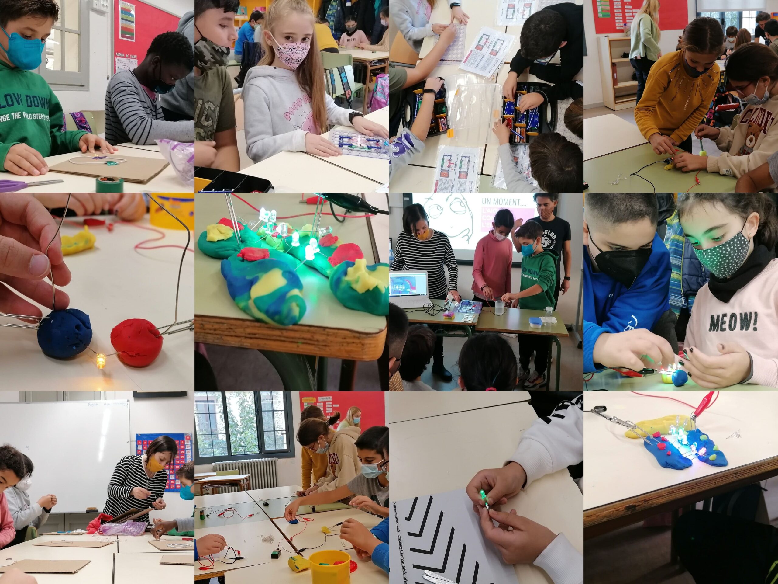 Primer de tot ens vam familiaritzar amb els diferents components dels circuits (bateries, LEDs, cables, motors, interruptors, resistors, fotoresistors…), tot construint circuits elèctrics de tota mena: des dels circuits “de tota la vida”, fets amb materials com cartró fusta, fins a sistemes més sofisticats on vem fer servir sensors. I fins i tot vam experimentar amb circuits de plastilina conductora.