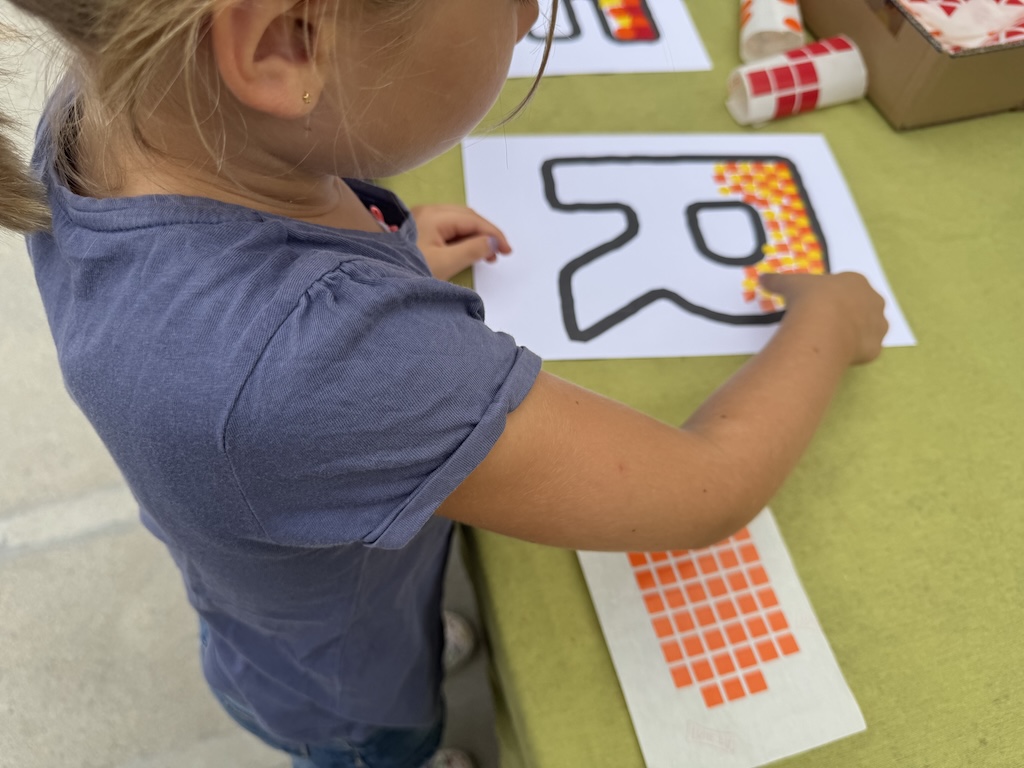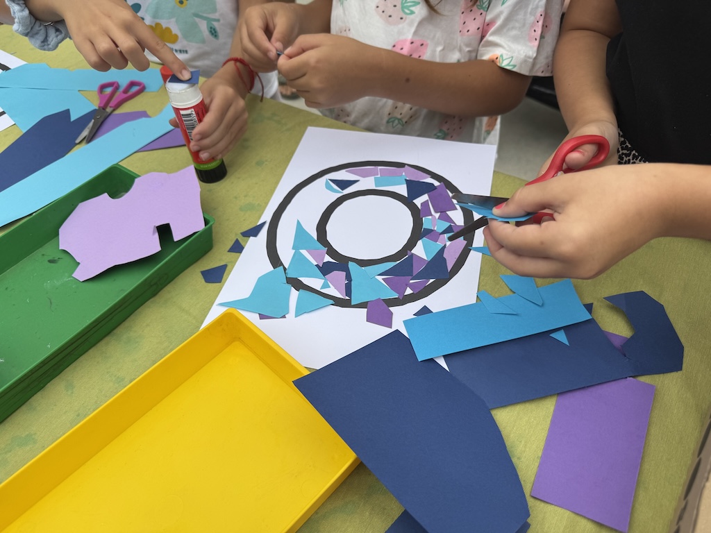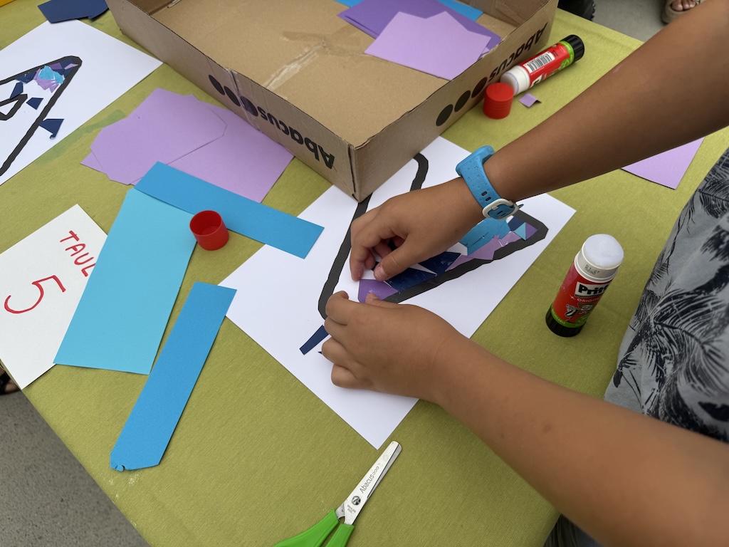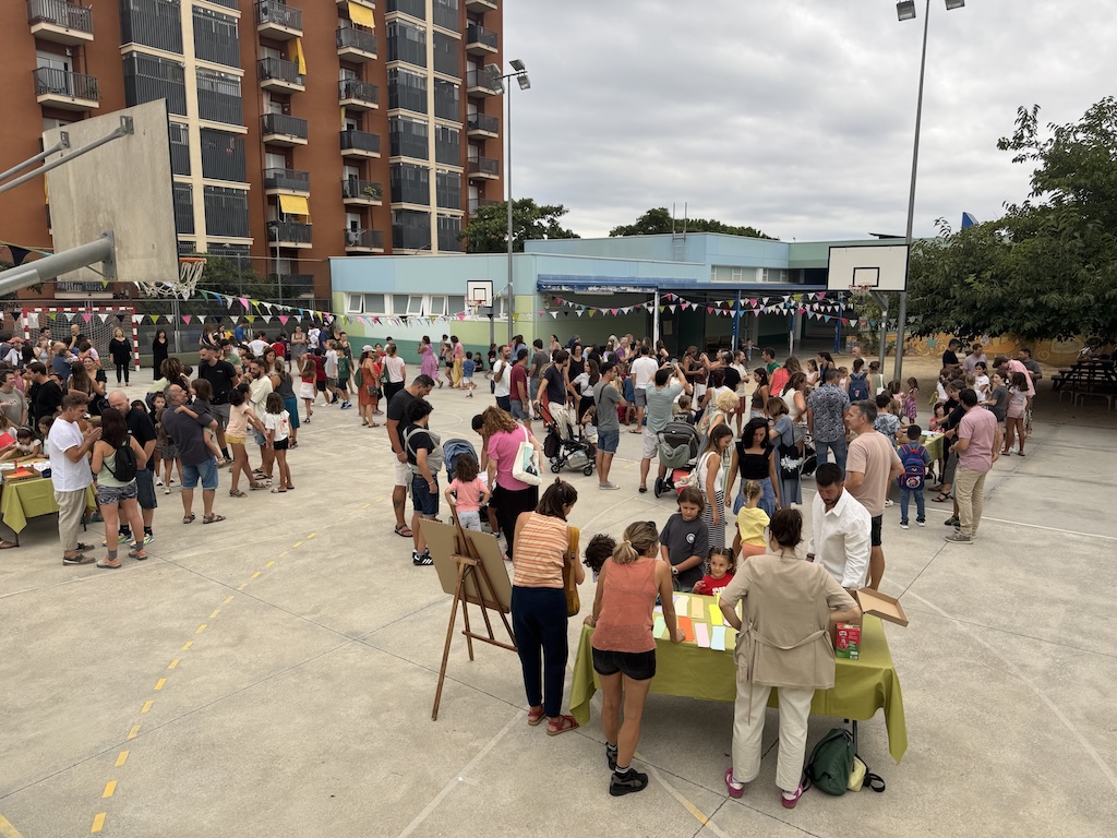 En entrar a l’escola, la música ja acompanyava l’ambient festiu i a la pista tothom ha trobat unes taules preparades amb lletres gegants per acolorir amb tècniques ben diverses. Cada família ha pogut escollir la lletra que volia i omplir-la de color, mentre compartia converses sobre l’estiu i les vacances amb altres famílies i mestres. Els nens i les nenes també aprofitaven per retrobar-se amb amics i amigues després de l’estiu.