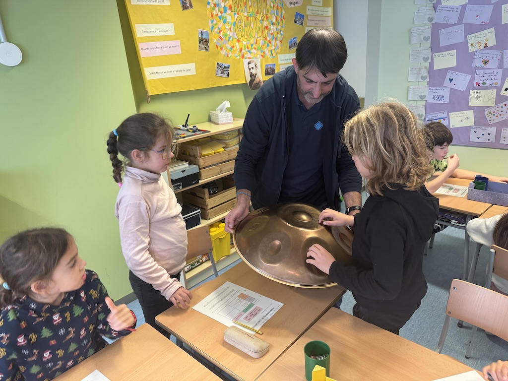 La classe va ser molt interessant perquè li vam poder fer moltes preguntes i vam poder relacionar com es produeix i es difon el so amb el handpan en comparació amb altres instruments sobre els quals ja hem investigat: percussió i corda fregada.
