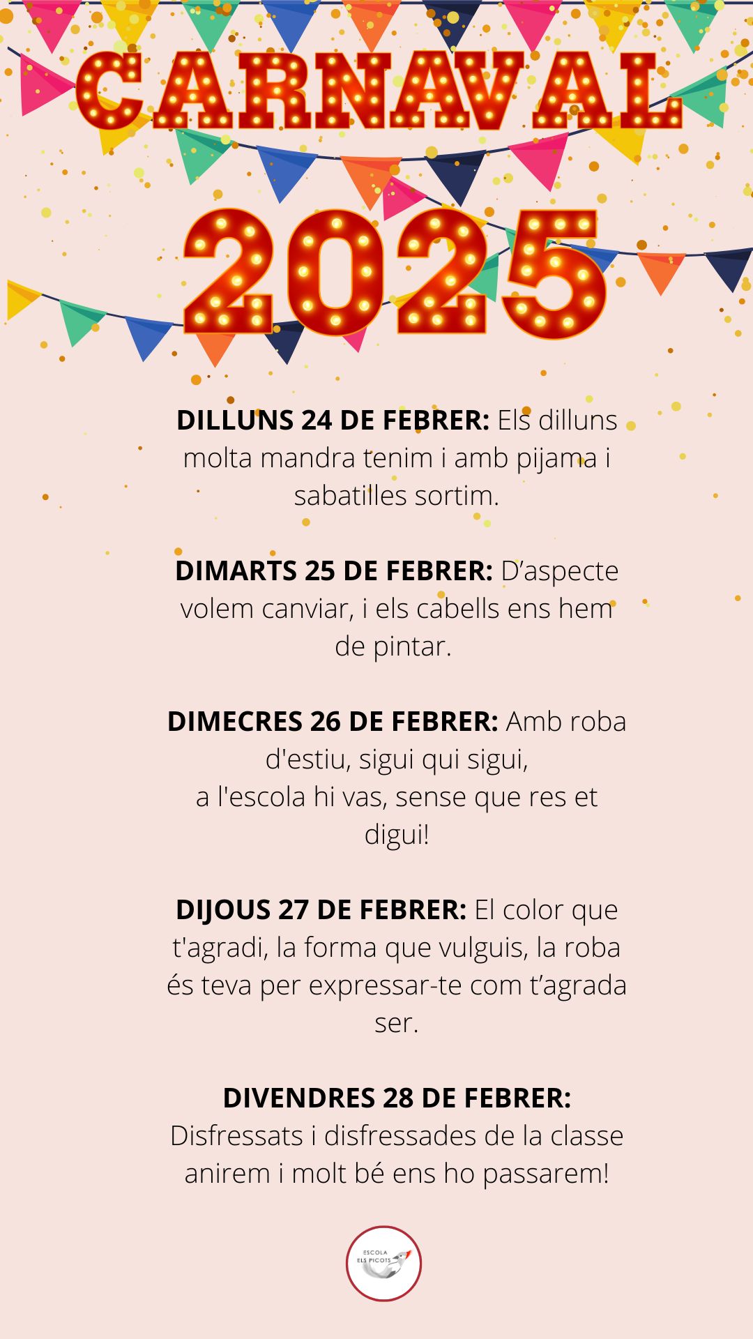 Prepareu-vos perquè aquesta setmana celebrem el Carnaval amb molta alegria i disbauxa! Cada dia seguirem unes consignes picotines ben divertides. Aquí us les deixem perquè ningú es quedi fora de la festa!