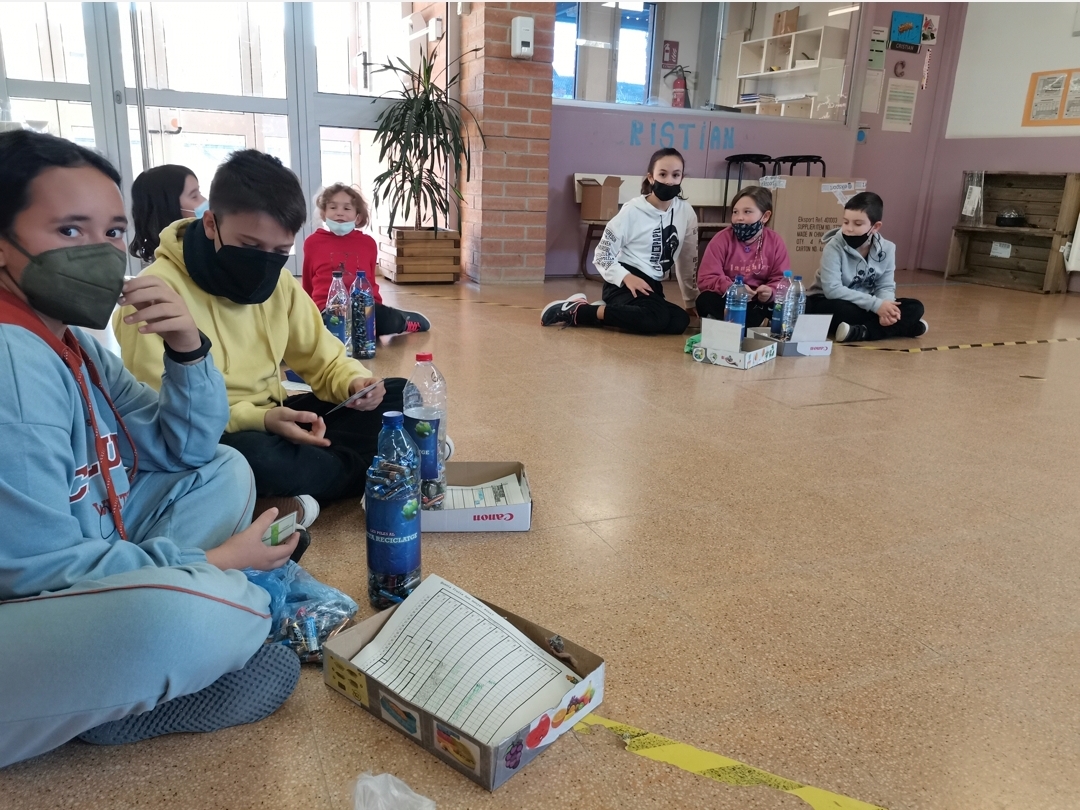 Els i les representants sostenibles de cada classe de P5 a 6è han portat a la trobada el gràfic de la fruita, la bola de paper d’alumini i les piles usades.
