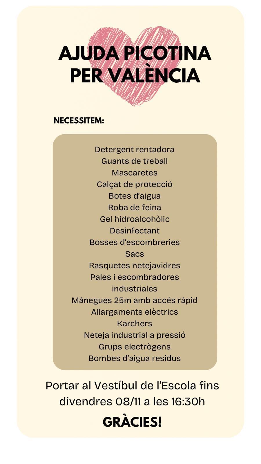 A l’Escola Els Picots volem mostrar el nostre suport a les persones afectades per les greus pluges de la DANA a València. L’AFA Els Picots ha posat en marxa una campanya de recollida de material essencial per ajudar en la recuperació de les zones més afectades.