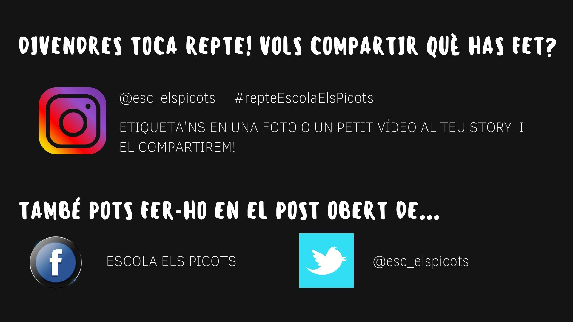 - Divendres → Es proposarà un repte per a tota l’escola. Si voleu compartir el resultat del repte, podeu publicar un story a Instragram etiquetant a l’escola (@esc_elspicots) i amb el hashtag #RepteEscolaElsPicots.