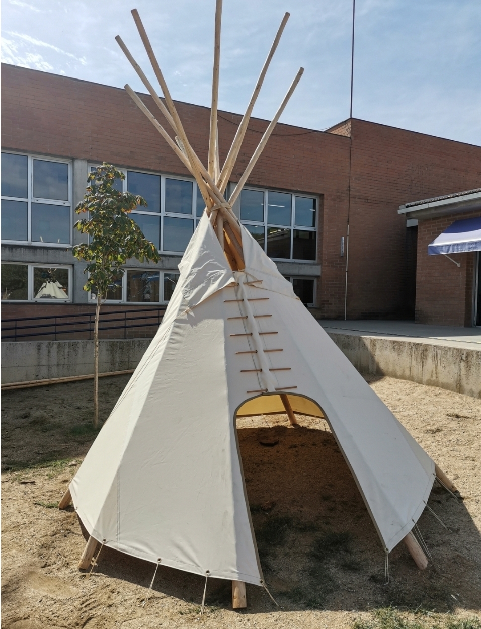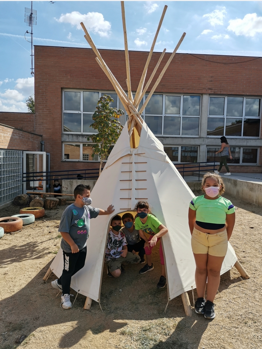 Ahir també es va instal·lar un tipi al pati dels castanyers (davant les classes de la comunitat de mitjans/es). Avui serà la gran estrena amb els infants! En unes setmanes s’instal·larà el segon tipi en aquest mateix espai.