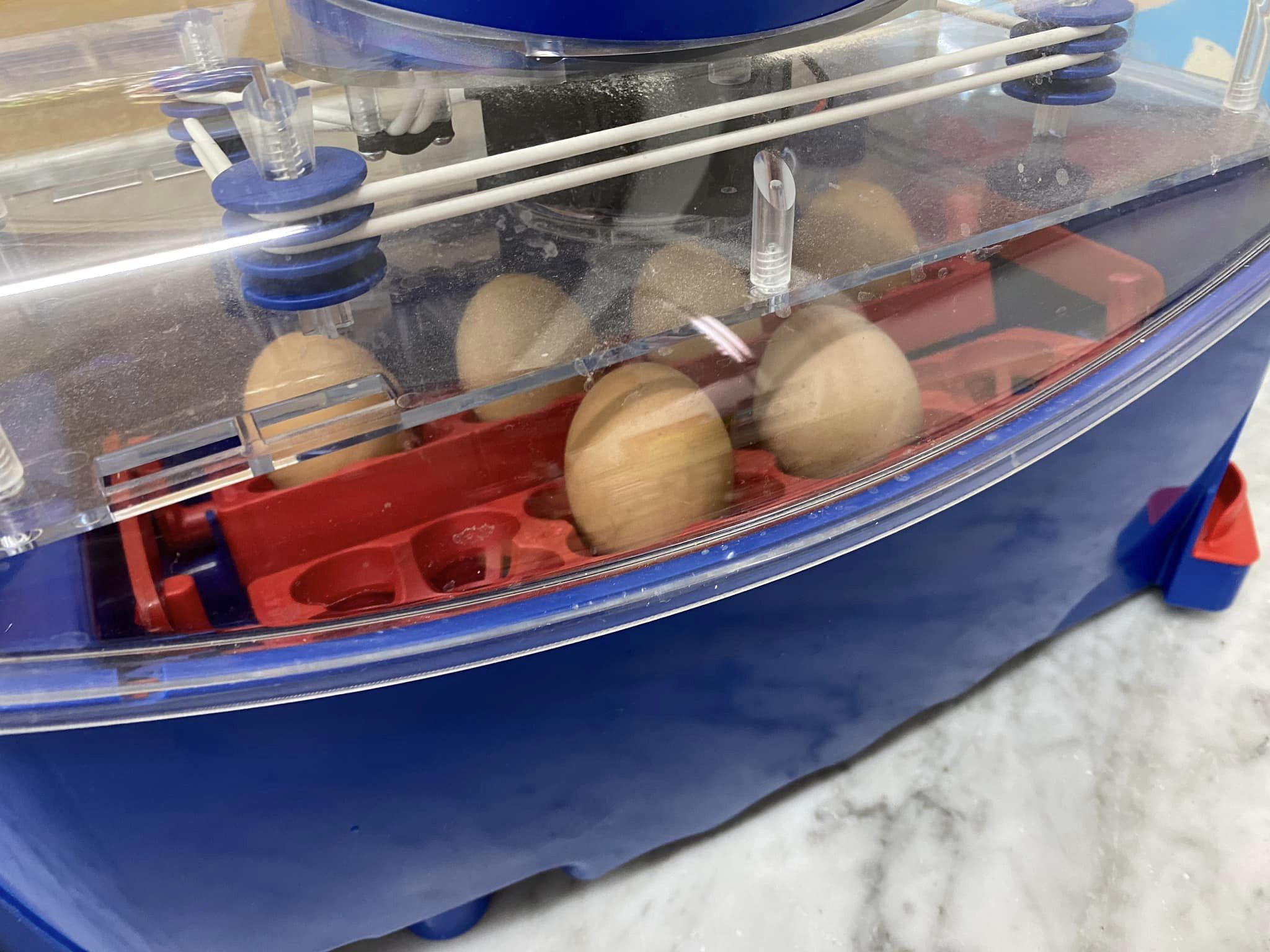 Hem posat 6 ous fecundats a dintre de la incubadora a una temperatura constant de 37,4°C simulant una incubació animal.