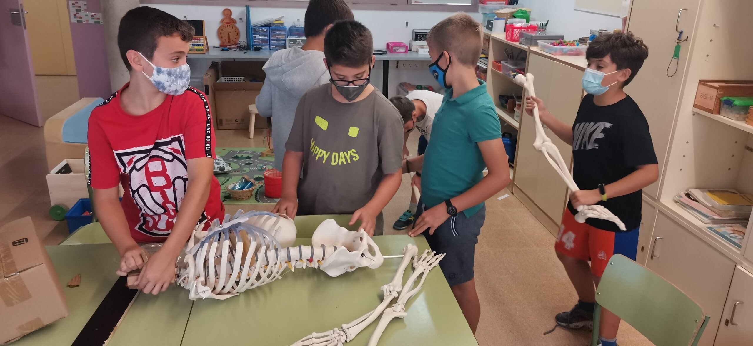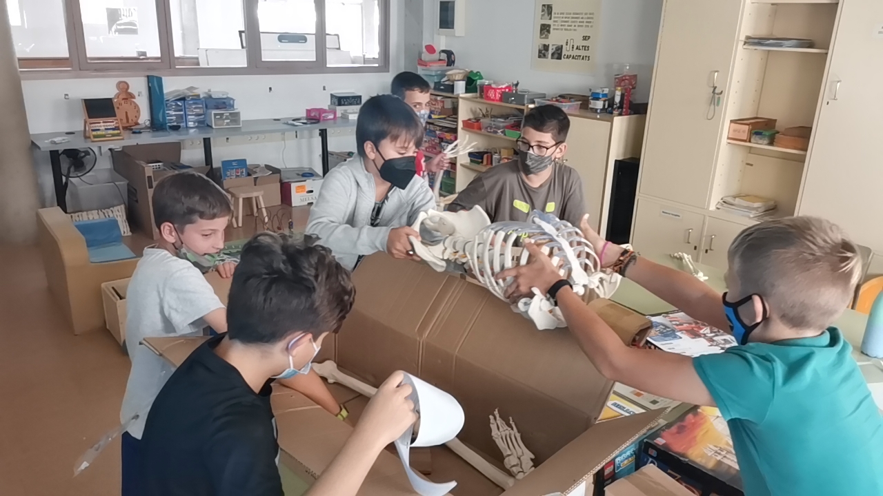 A la primera sessió vàrem realitzar una dinàmica de grup on tothom va col·laborar: havíem de muntar un esquelet amb el seu suport. Tot i que vàrem anar a bon ritme, vàrem tenir algun contratemps amb el crani, inclús vàrem haver ser dentistes! El proper dimarts l’intentarem acabar per entregar-lo a la comunitat de grans!