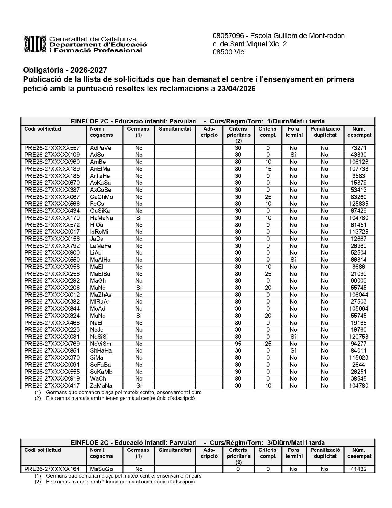 Avui surt publicat el llistat de sol·licituds que han seleccionat el nostre centre en primera opció amb la puntuació, un cop resoltes les reclamacions.