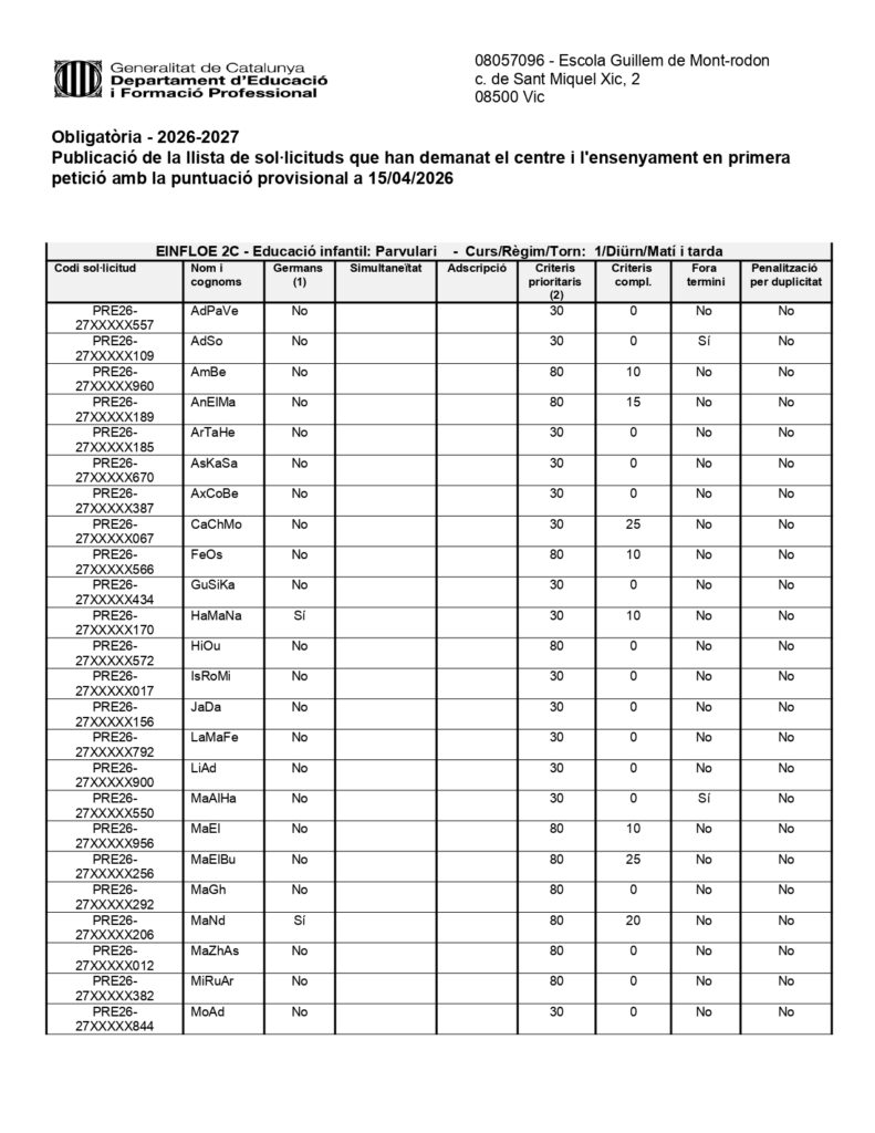 Publicació del llistat de sol·licituds amb la puntuació provisionalPer admin / 15 d'abril de 2026 / General Portada Avui surt publicat el llistat de sol·licituds que han seleccionat el nostre centre en primera opció amb la puntuació provisional.