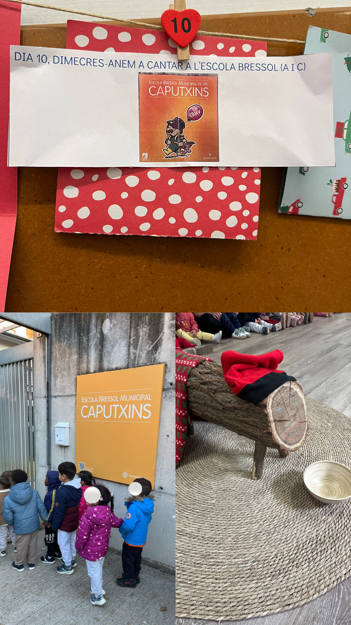 Avui, el calendari d’Advent ens ha proposat fer una visita a l’escola bressol de Caputxins i fer-los un recital de Nadal (poema i cançó). Ha estat una sortida molt bonica i el recital tot un èxit. Els infants de Caputxins ens han cantat la cançó del Tió i hem compartit amb ells una estona de joc al jardí.