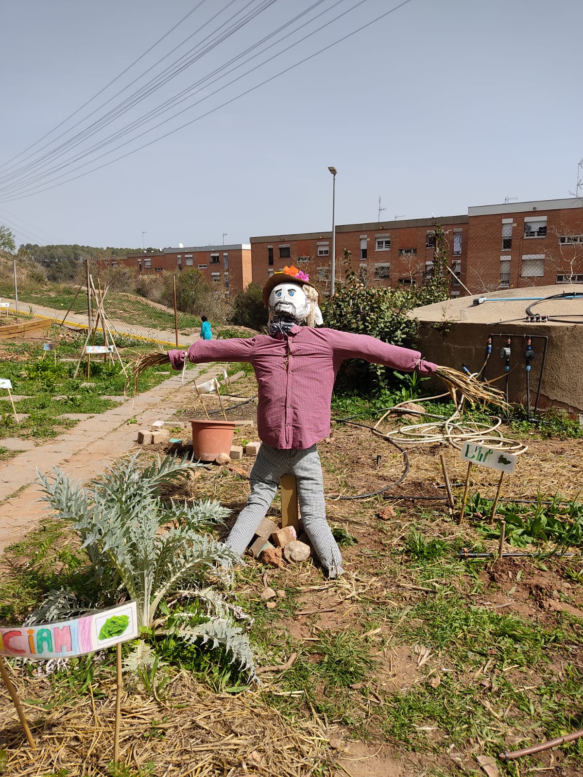 CICLE SUPERIOR FA UN ESPANTAOCELLS Laura L08/04/24 A cicle superior hem fet dos espantaocells pel nostre hort. I què bé ens ho hem passat! Amb roba vella, una bala de palla i molta imaginació hem fabricat els nostres dos espantaocells. Us pengem fotografies del nostre procés de creació.