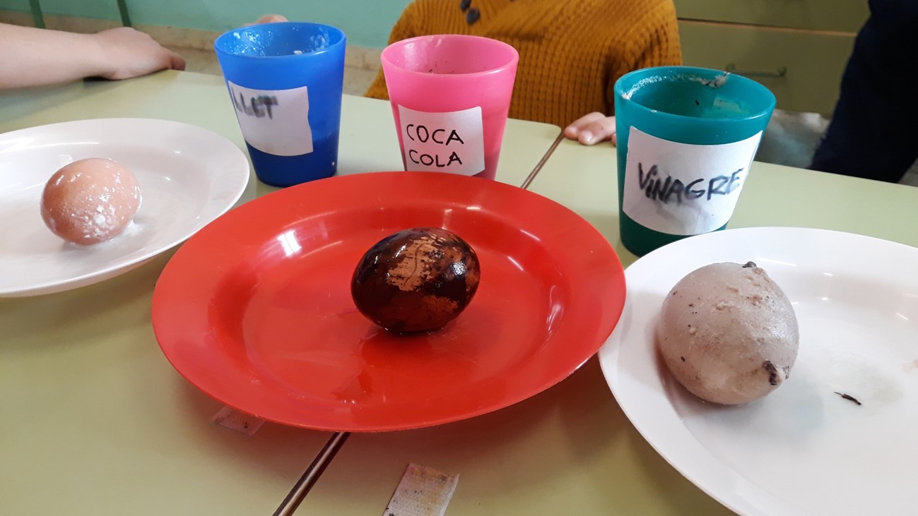 Els nens i nenes de 2n hem fet un experiment per saber quines begudes cuiden millor les nostres dents. Les closques dels ous són molt semblants a l’esmalt de les nostres dents. Hem agafat 3 ous i els hem posat amb tres líquids diferents: amb llet, amb cola i amb vinagre. Al cap d’uns dies hem vist que el vinagre es menja l’esmalt, que la cola deixa negra l’ou i que la llet queda l’ou ben net. Així doncs, hem de vigilar el que bevem i si cal rentar-nos les dents per cuidar-les millor!