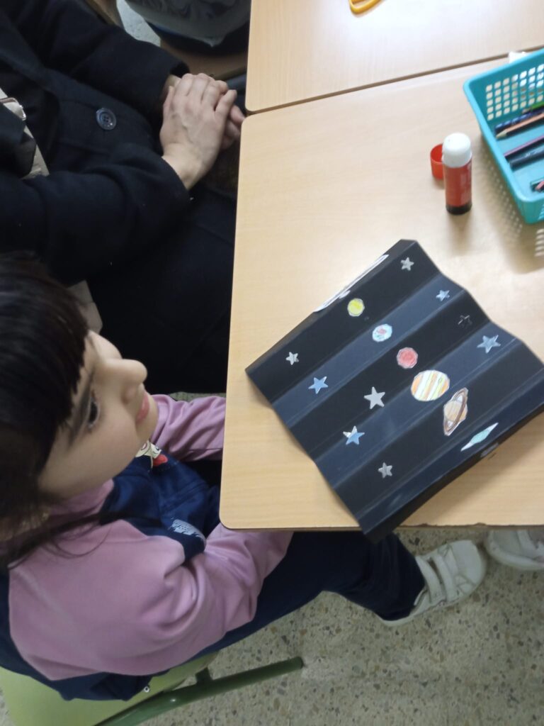Després, juntament amb les mares i germans vam fer una petita manualitat sobre l’Univers. Tot i que estàvem una mica nerviosos per haver de parlar davant de tanta gent, vam passar una tarda molt agradable amb molt bona companyia.