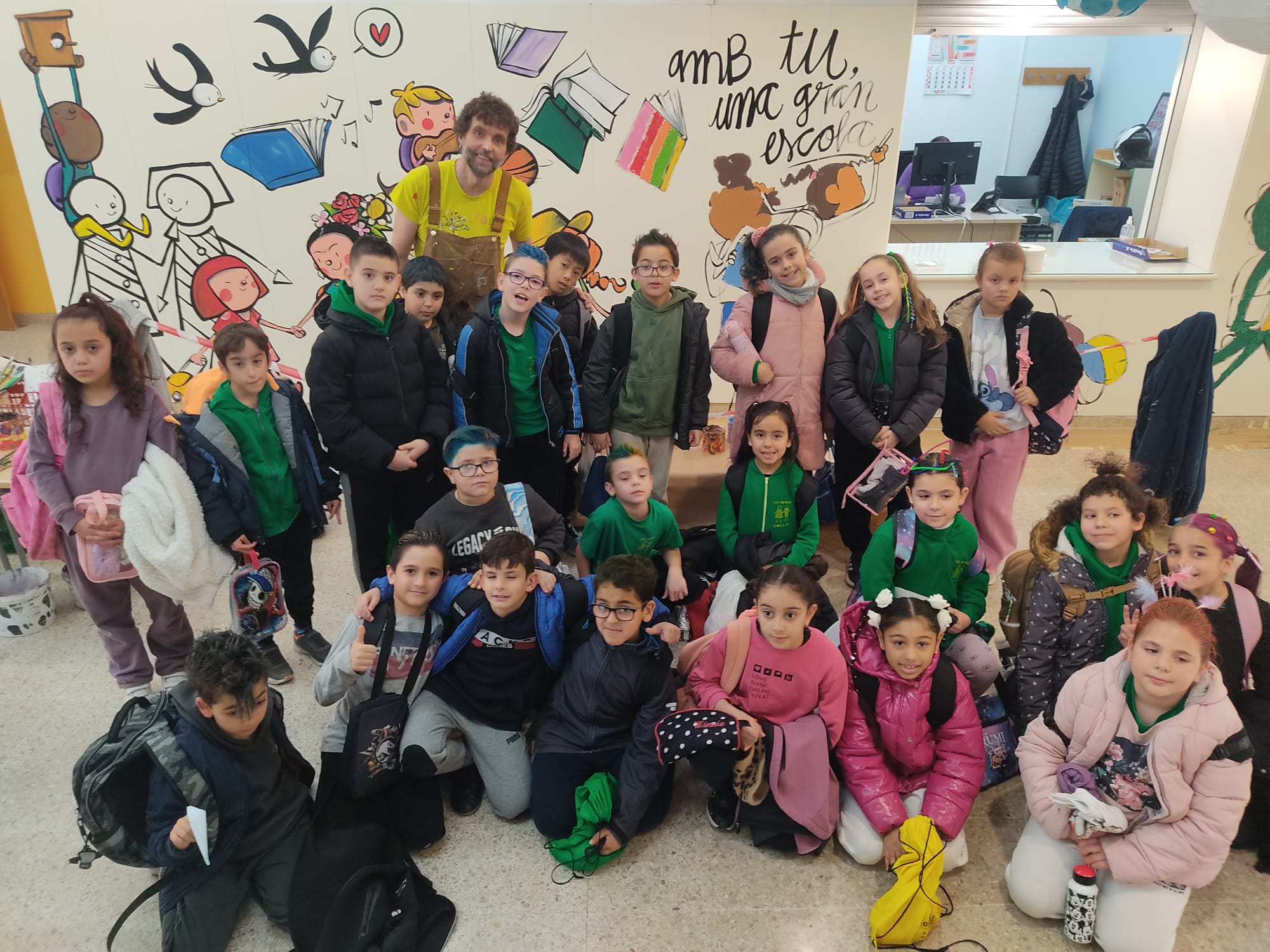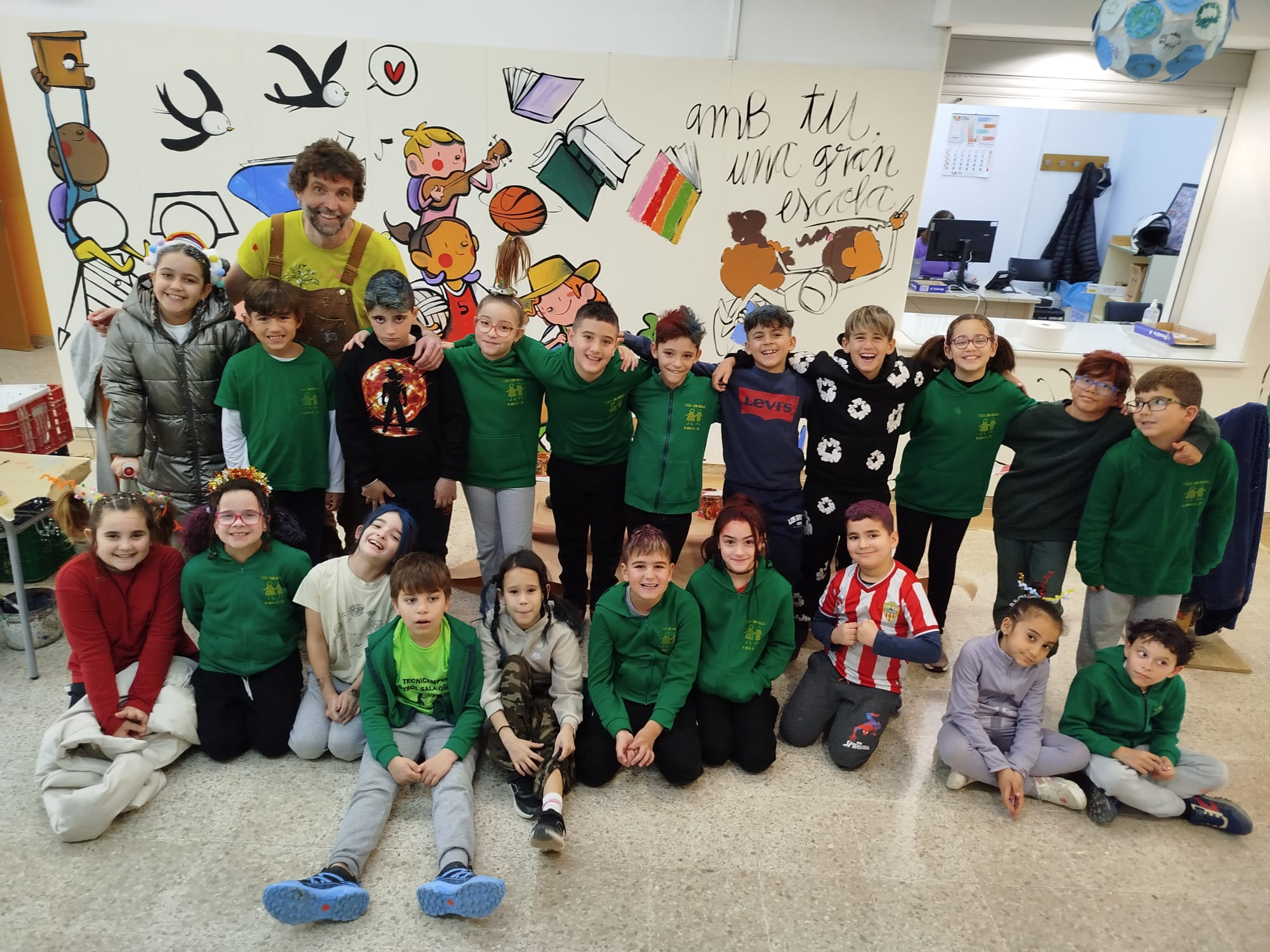 En Joan Turu ha vingut dos dies a la nostra escola. El primer dia ens va explicar en què consisteix la seva feina d’il·lustrador: pintar murals, il·lustrar contes, fer dissenys per samarretes… Després prenent com a referència el nostre eslògan “Una escola gran, una gran escola”, vam fer dibuixos i li vam donar perquè l’ajudessin a fer un dibuix al hall de l’escola. El segon dia vam pintar el dibuix amb colors molt vius, i més tard ell va fer els detalls. Ens ha agradat molt aquesta experiència i ha quedat un mural molt maco!