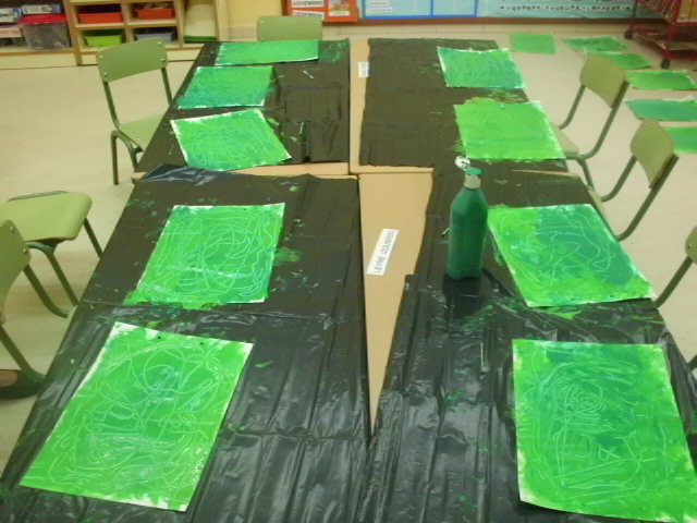 Els nens i nenes de P.4 A i B, han pintat amb les mans veien la textura de la pintura i fent barreges amb diferents tonalitats de verd.
