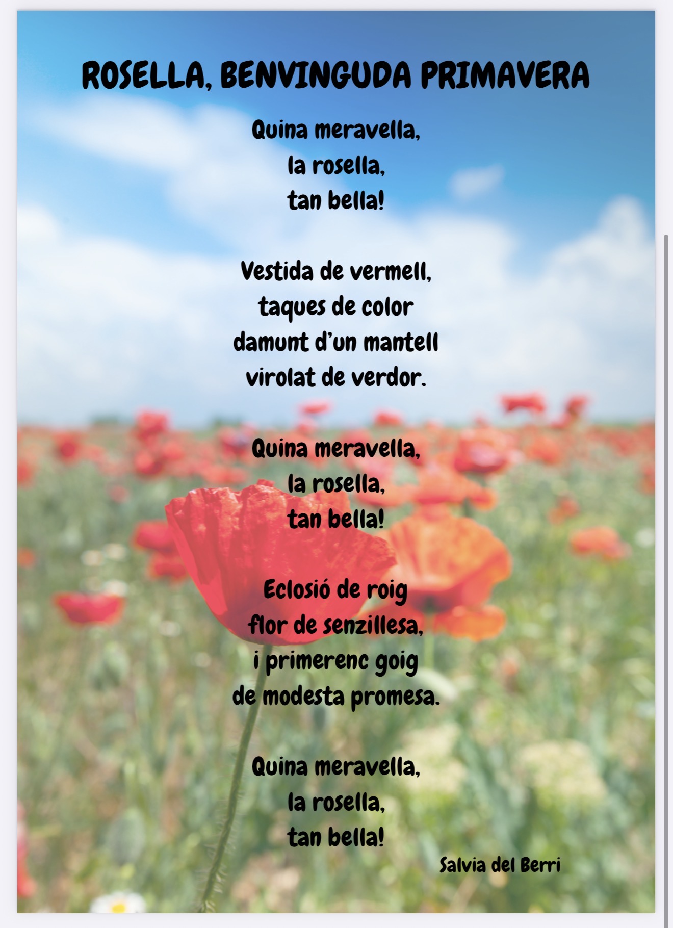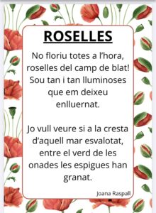 Aquesta iniciativa l’hem ofert des de l’escola a l’alumnat que voluntàriament vulgui participar memoritzant un poema i recitant-lo al seu tutor o tutora o qualsevol mestre/a.