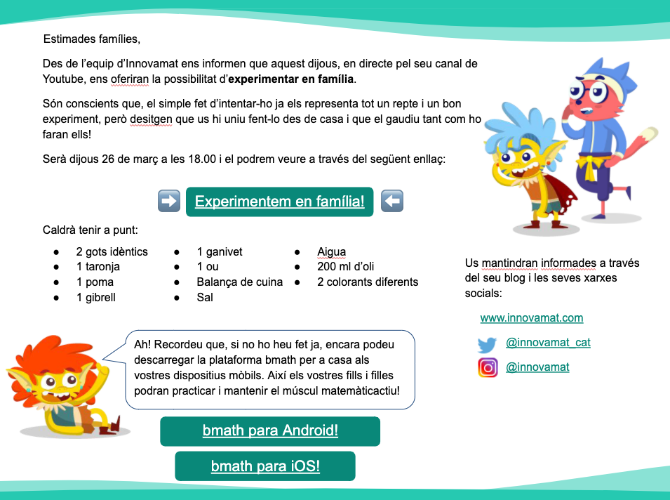 Des d’Innovamat ens fa molta il·lusió convidar-vos al nostre primer experiment en família! Serà un experiment científic, que hem preparat amb els nostres companys d’eXplorium, pensat perquè les famílies amb fills d’Infantil i Primària puguin passar una estona plegats gaudint de la ciència. El retransmetrem aquest dijous 26 de març a les 18:00 a través del nostre canal de Youtube. […]