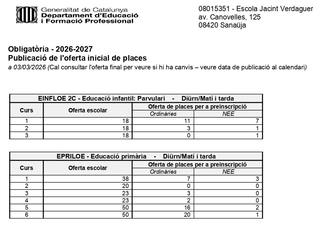 Preinscripció curs 2026-2027 Avui s’ha fet pública l’oferta inicial de places de l’Escola Jacint Verdaguer per al curs 2026-2027, d’acord amb la planificació del Departament d’Educació i Formació Professional. Aquesta oferta determina el nombre de places disponibles per a cada nivell educatiu de cara al procés de preinscripció. El període de preinscripció començarà demà, 4 […]