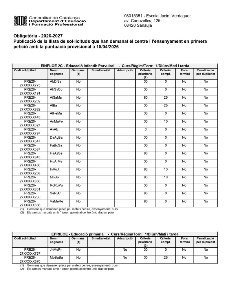 Benvolgudes famílies, Us informem que ja s’ha fet pública la llista de sol·licituds que han demanat el centre i l’ensenyament en primera petició, amb la puntuació definitiva un cop resoltes les reclamacions (23/04/2026). Podeu consultar el detall complet en el document adjunt, així com fer la consulta individual a través de la web preinscripcio.gencat.cat, amb