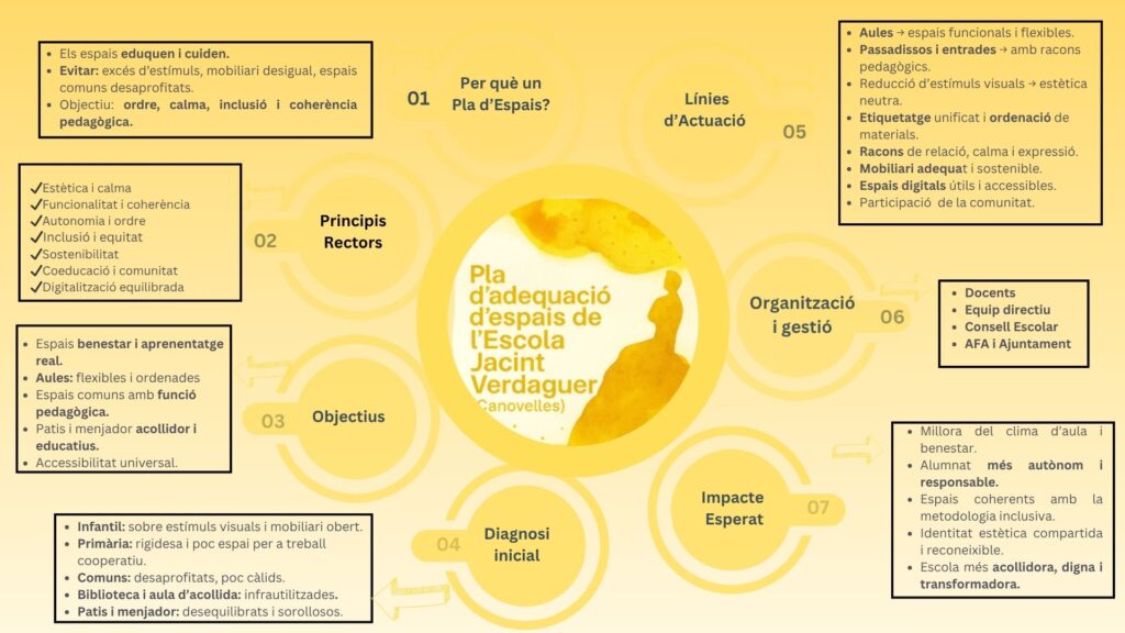 A l’Escola Jacint Verdaguer reconeixem que els espais eduquen i cuiden. Amb el nostre Pla d’Adequació d’Espais transformem aules, passadissos, patis i zones comunes per crear entorns acollidors, ordenats i pedagògics, on cada infant se senti bé i tingui autonomia per aprendre.