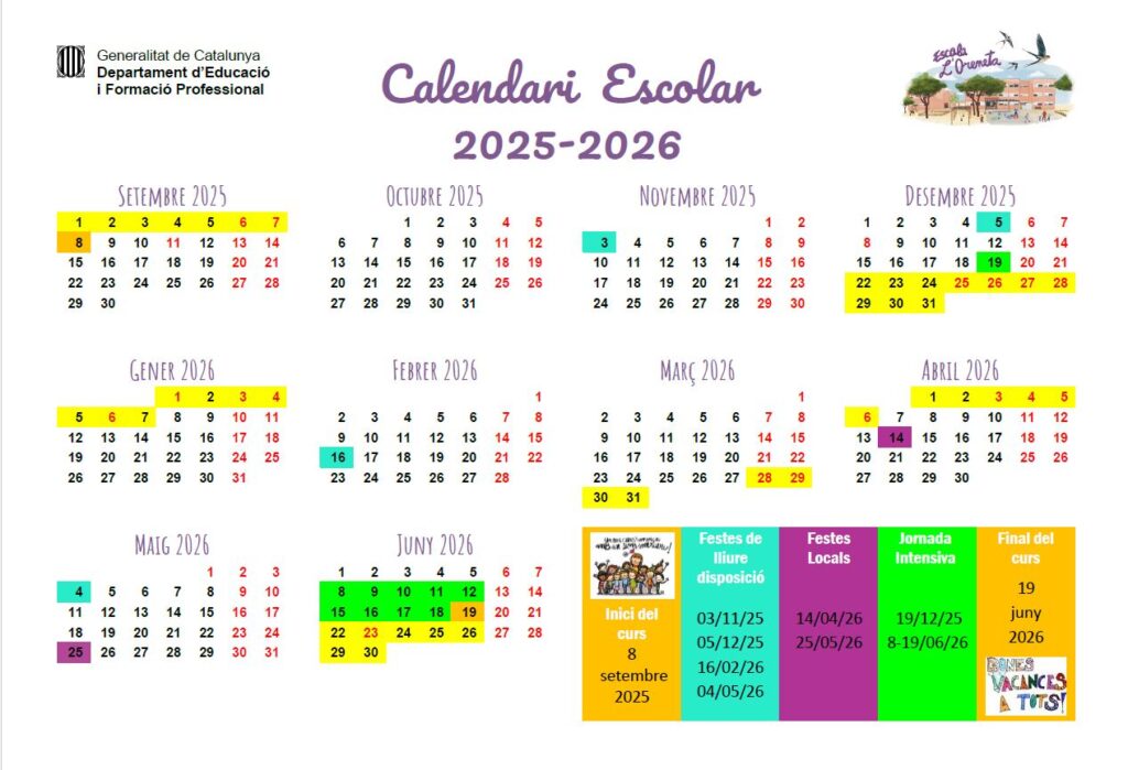 L’horari lectiu del centre és de 9 a 12.30 h i de 15.00 a 16.30 h per a tots els alumnes del centre. El dia 19 de desembre de 2025 i a partir del 8 de juny de 2026 es realitza horari intensiu de 9:00h a 13:00h. *L’alumnat que utilitza el servei de menjador sortirà a les 15:30h, si tenen autorització per marxar sols. Les famílies podreu venir a recollir als infants a partir de les 15:00h i, com a màxim, a les 15.30h.