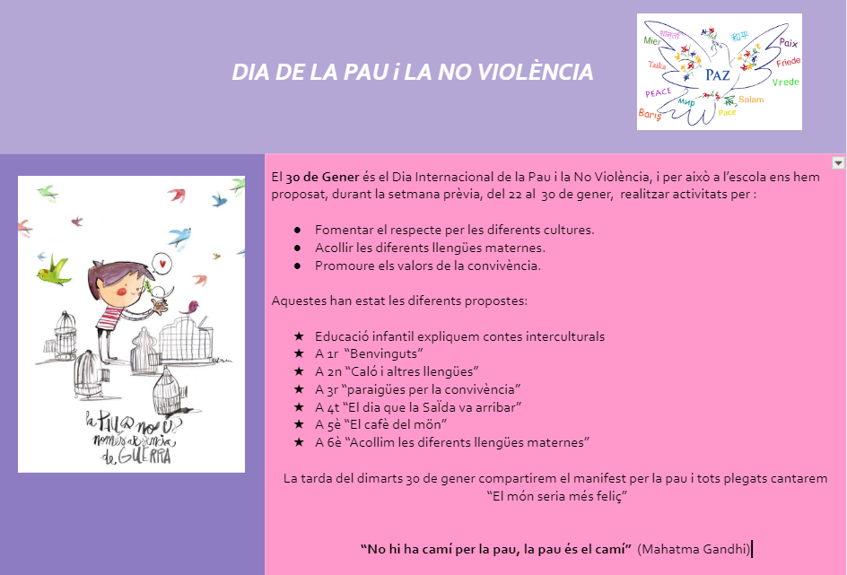 Al llarg d’aquestes últims dies a la sessió de valors o segons coordinació de les col·laboracions amb la nostra promotora escolar hem realitzat activitats vinculades amb la pau més propera a la nostra realitat i al nostre dia a dia. Hem realitzat diferents propostes que promouen el valor de l’interculturalitat, la riquesa de la multiculturalitat i la l’acollida a les diferents llengües maternes dels nostres infants. Totes elles són molt interessants i estan són promogudes pel PEE i el Pla de la promotora escolar. A la nostra escola les hem graduat i planificat per nivells i d’aquesta manera garantim que al llarg de l’escolaritat un infant pugui gaudir fi passar per totes elles.