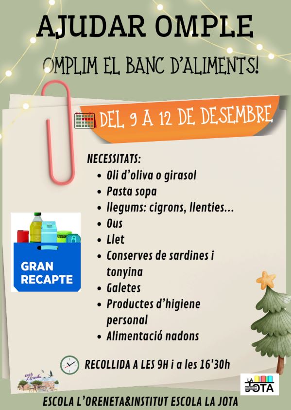 Podeu portar aliments els dies 9, 10, 11 i 12 de desembre a les 9:00 hi les 16:30 a les portes d’accés 1 i 2 de l’escola aportant tot allò que posa a la llista que trobareu al cartell informatiu