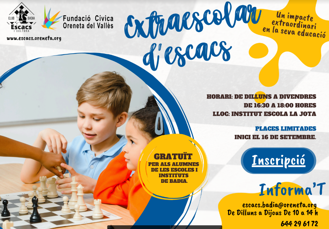D’altra banda, recordeu que també s’ofereixen tallers extraescolars d’escacs gratuïts al municipi.