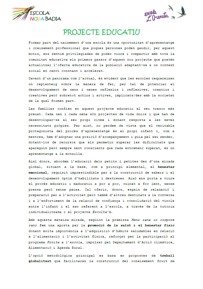 En aquests moments, que l’escola està començant a fer camí, volem construir un projecte compartit amb la comunitat educativa, fruit d’un procés de reflexió i debat de tots els sectors implicats i, és per això, que estem treballant en aquesta línia. Com a tastet, presentem les línies d’actuació que hem previst així com els trets d’identitat del centre sobre els quals establirem la base d’un projecte comú i que podeu consultar clicant sobre la imatge.