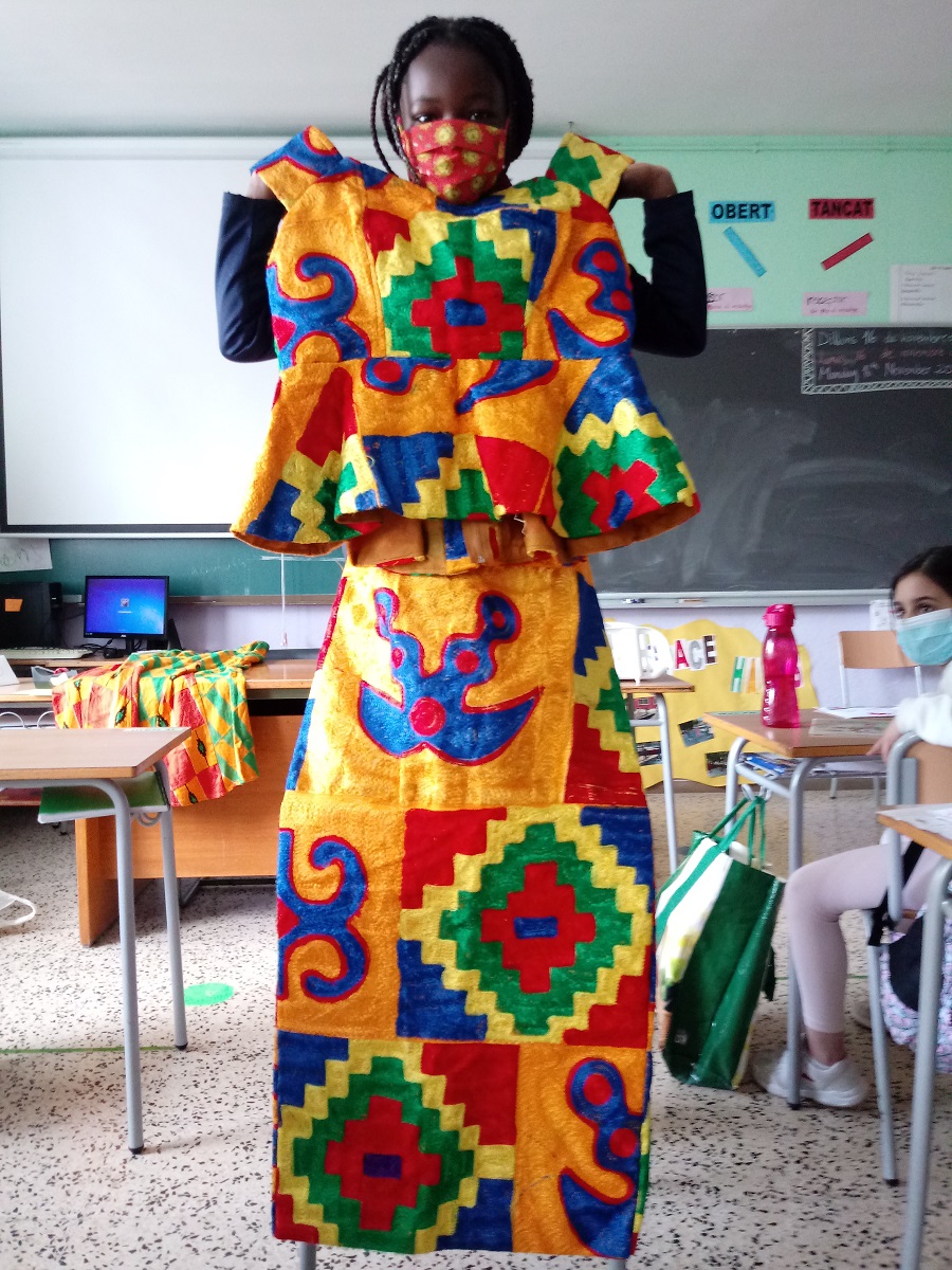 El dilluns 16, una de les alumnes que tenim d’origen ghanès, ens va explicar coses sobre el poble on vivia i ens va portar un vestit preciós per anar a l’església. Moltes gràcies Beatrice!
