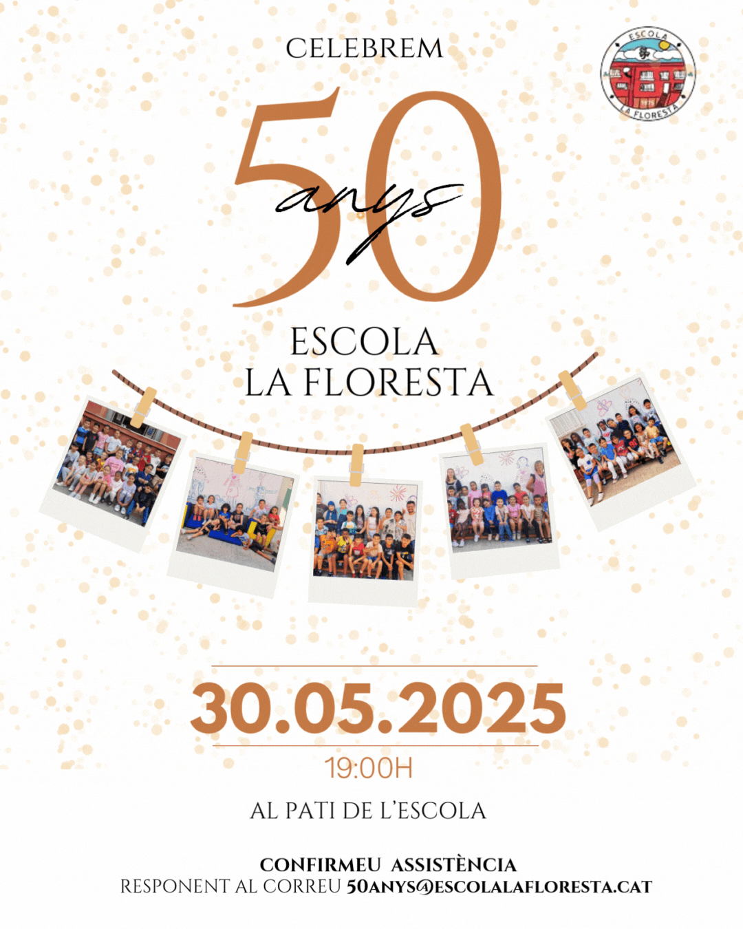 divendres 30 de maig a les 19h al pati de l’escola: celebració i trobada d’antics alumnes, docents i altre personal que han tingut relació amb l’escola al llarg d’aquests 50 anys. (si teniu clar que vindreu, ens hauríeu d’enviar un correu amb el vostre nom i cognoms i relació amb l’escola al correu 50anys@escolalafloresta.cat per tal de tenir una previsió de participació).
