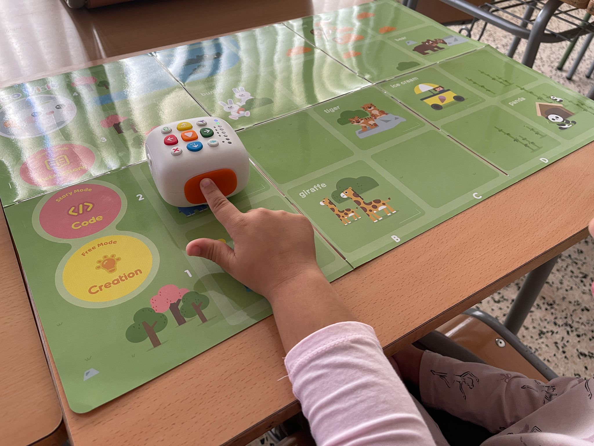 Amb molta curiositat i entusiasme, els nens i nenes estan aprenen a donar instruccions bàsiques al robot perquè es mogui per un tauler, tot treballant aspectes com l’orientació espacial, la seqüenciació i la resolució de problemes. El Tale-Bot, amb el seu disseny intuïtiu i atractiu, ha desperta l’interès de tot l’alumnat, que participa activament en les activitats proposades.