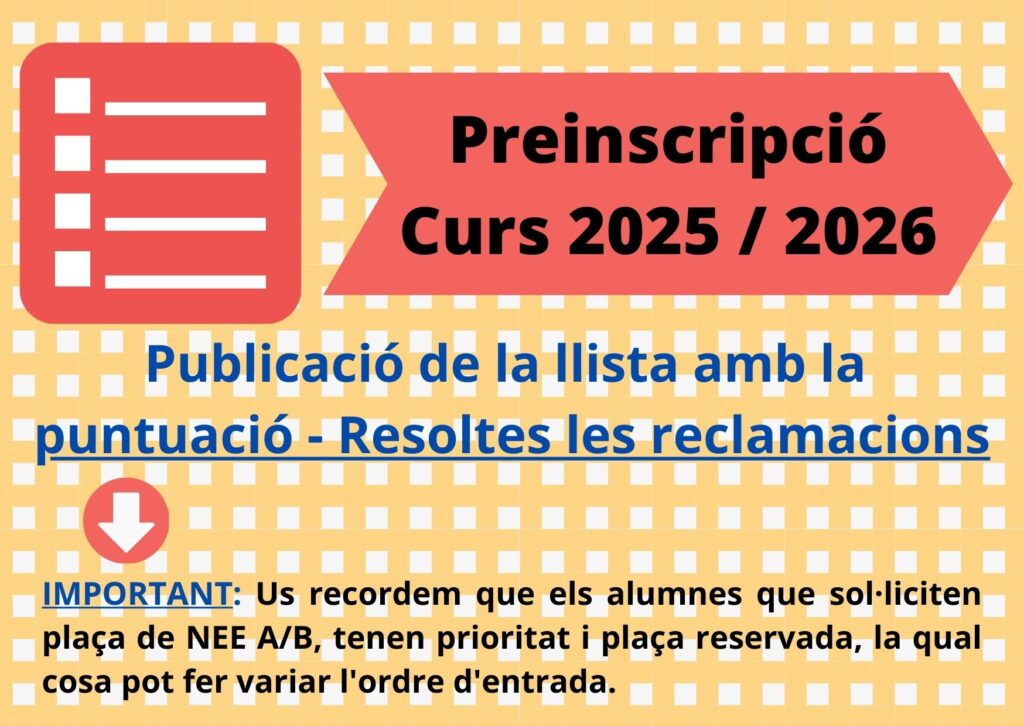 Llista de sol·licituds que han demanat el centre i l’ensenyament en primera petició amb la puntuació resoltes les reclamacions a 05/05/2025 Feu un comentari / Per admin / 5 de maig de 2025 / General Portada