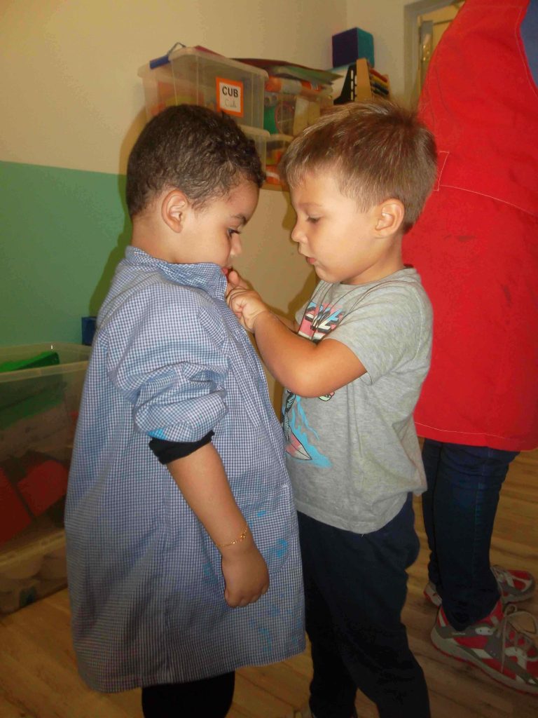 Mireu que dolces aquestes imatges! Nens i nenes de P3 ajudant-se a posar-se i a botonar-se la bata…
