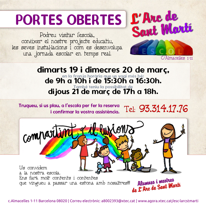 JORNADES DE PORTES OBERTES 2019 Aquest és el nostre calendari de Portes Obertes. Us hi esperem!!! PER A NOVES MATRÍCULES: DATA HORARI Dimarts 19 de març Dimecres 20 de març Podreu visitar l’escola, conèixer el nostre projecte eductiu, les seves instal·lacions i com es desenvolupa una jornada escolar en temps real. Trieu la data […]