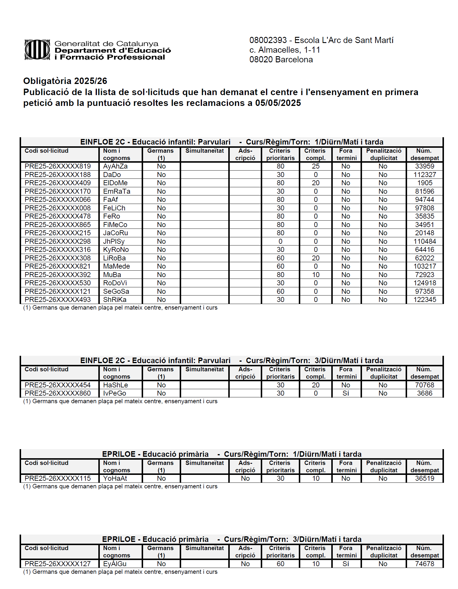 Publicació de la llista de sol·licituds que han demanat el centre i l’ensenyament en primera petició amb la puntuació resoltes les reclamacions a 05/05/2025 Feu un comentari / Per admin / 5 de maig de 2025 / Portada