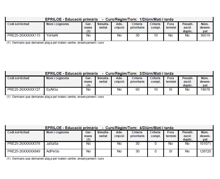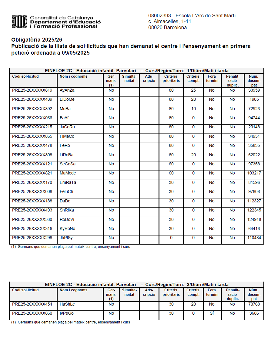 Publicació de la llista de sol·licituds que han demanat el centre i l’ensenyament en primera petició ordenada a 09/05/2025