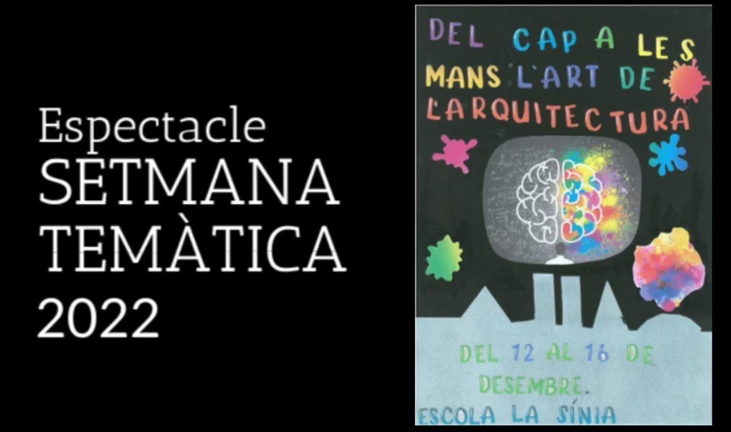 El vídeo de l’espectacle de la Setmana Temàtica 2022 Escola La Sínia19/01/23 Us compartim el vídeo de les actuacions de l’espectacle de la Setmana Temàtica “Del cap a les mans: l’art de l’arquitectura”.