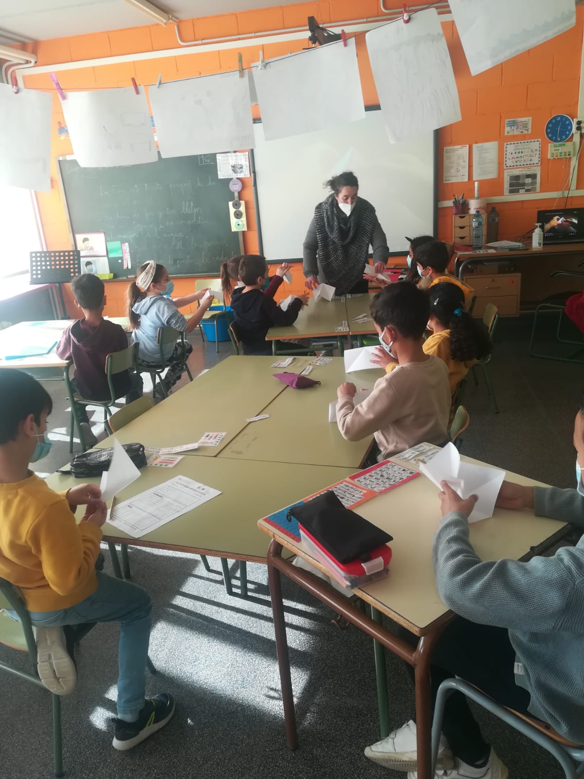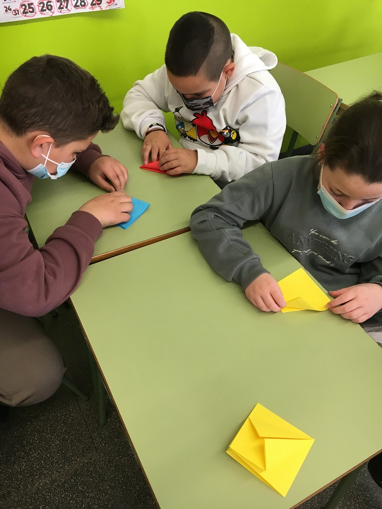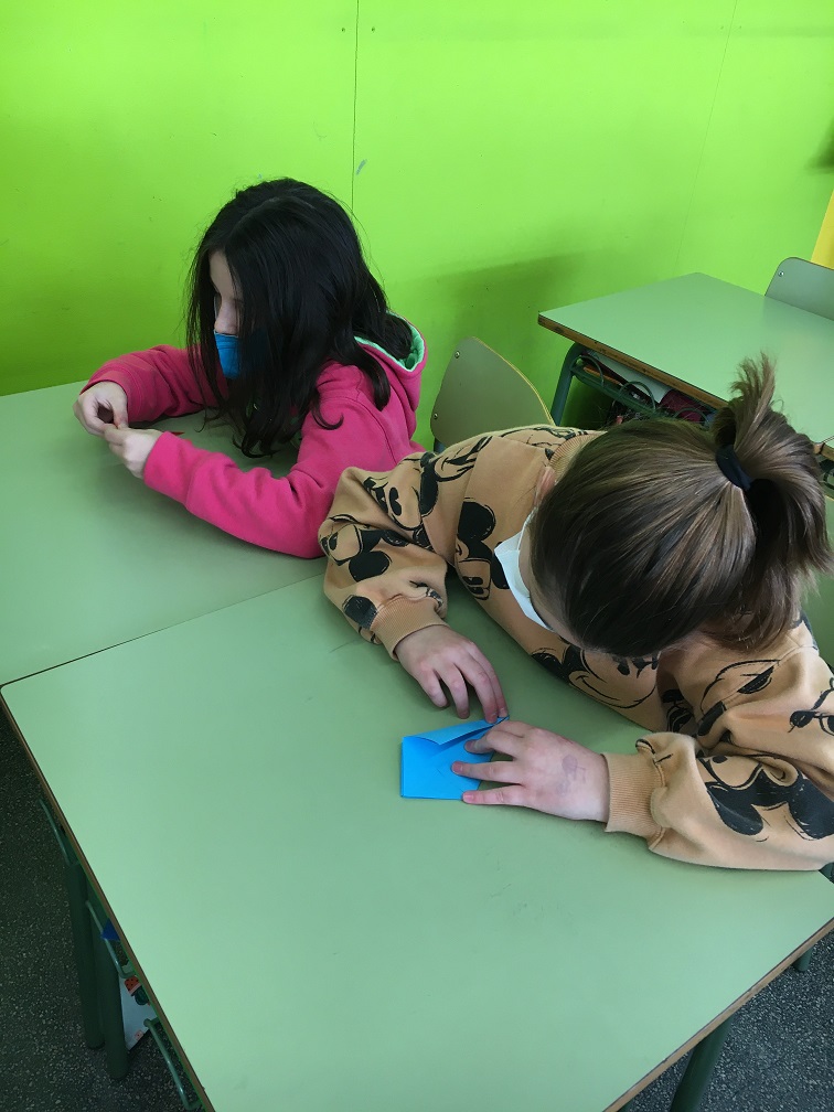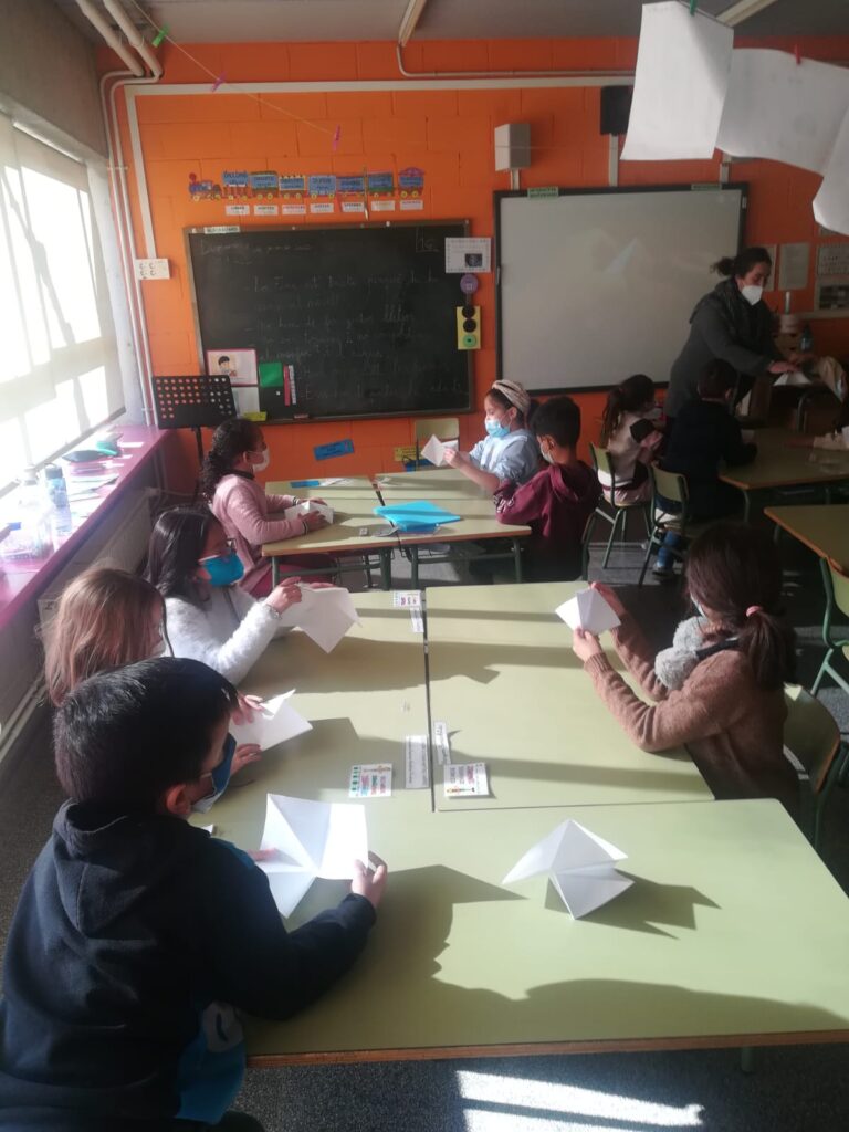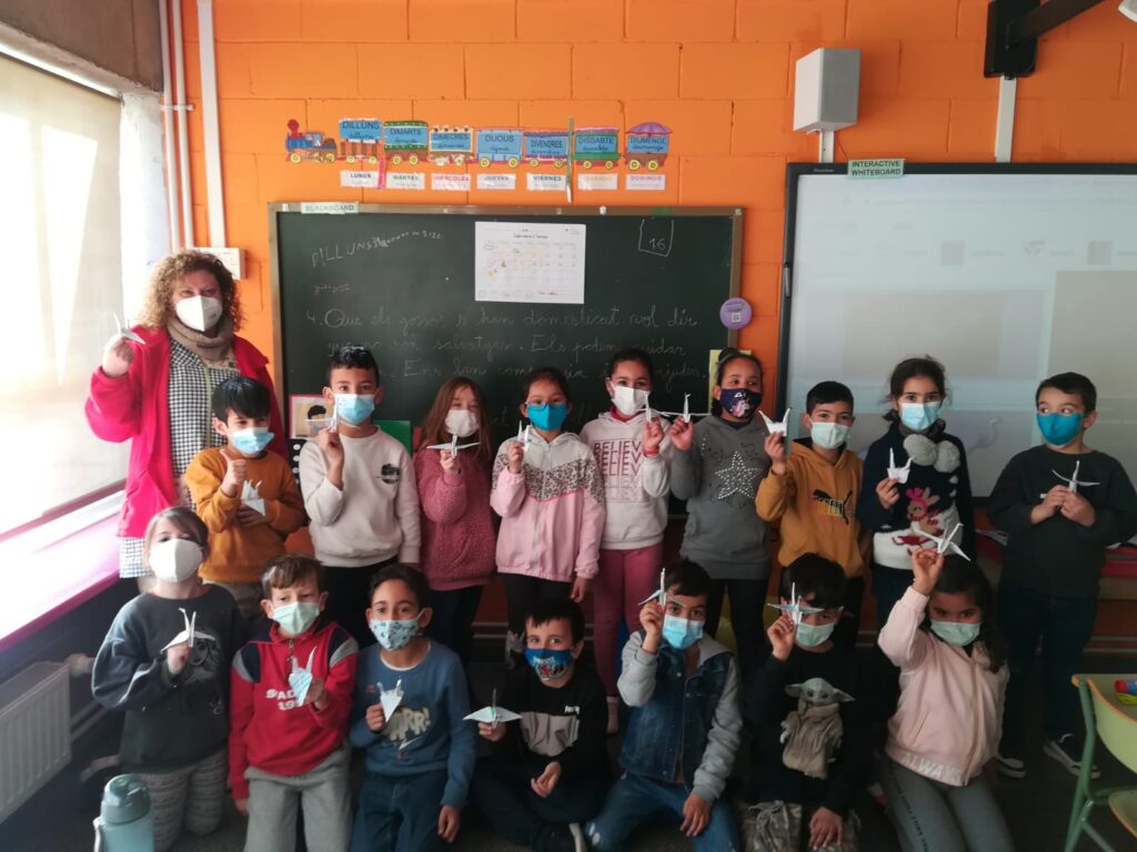 Hem escoltat la història de la Sadako, una nena que va patir les conseqüències de la guerra. Aquesta nena volia fer 1.000 grues de paper per salvar-se i és per això que nosaltres, per commemorar aquest dia, també les hem volgut fer. No hem arribat als mil ocells, però ens han quedat molt bé i els hem exposat a l’entrada de l’escola.